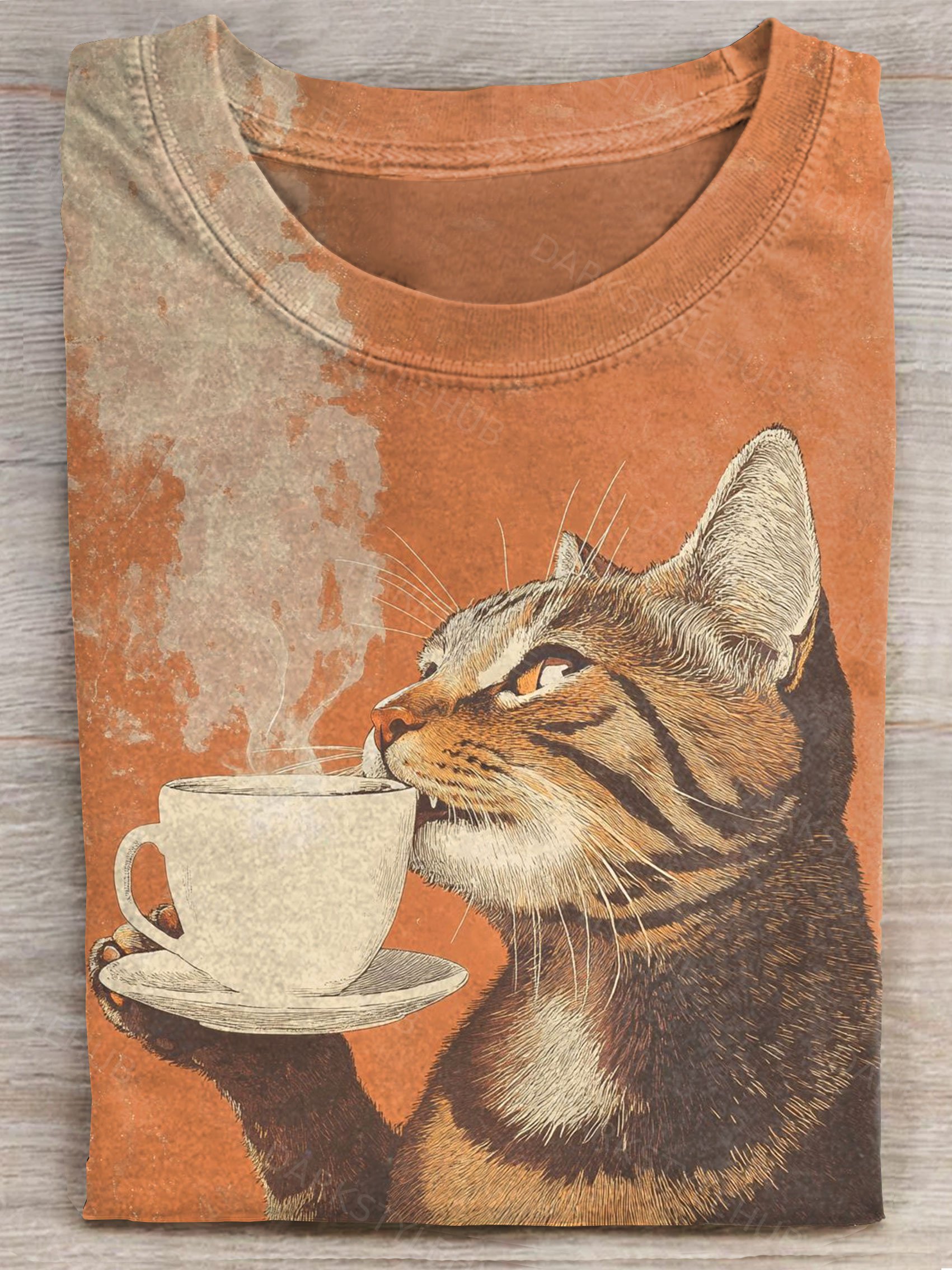 Vintage Cat With Coffee Art Print Casaul Short Sleeve T-shirt