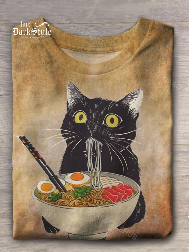 Women's Cat Eating Noodles Funny Print Loose Casual T-shirt