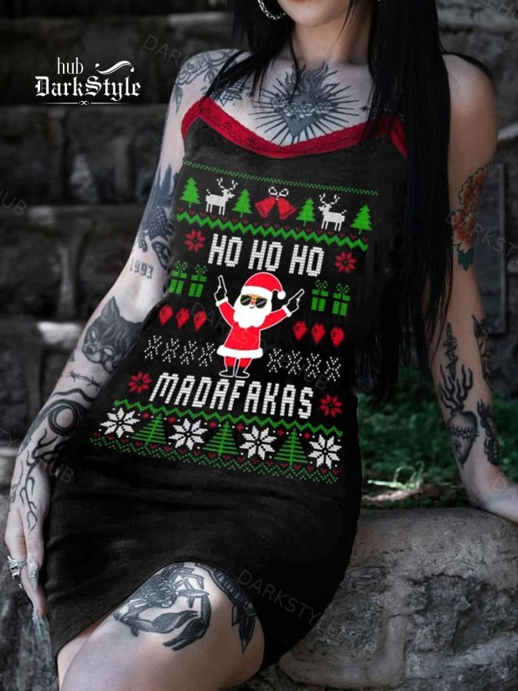 Women's Santa Claus Mosaic with Gun Print Lace Strap Dress