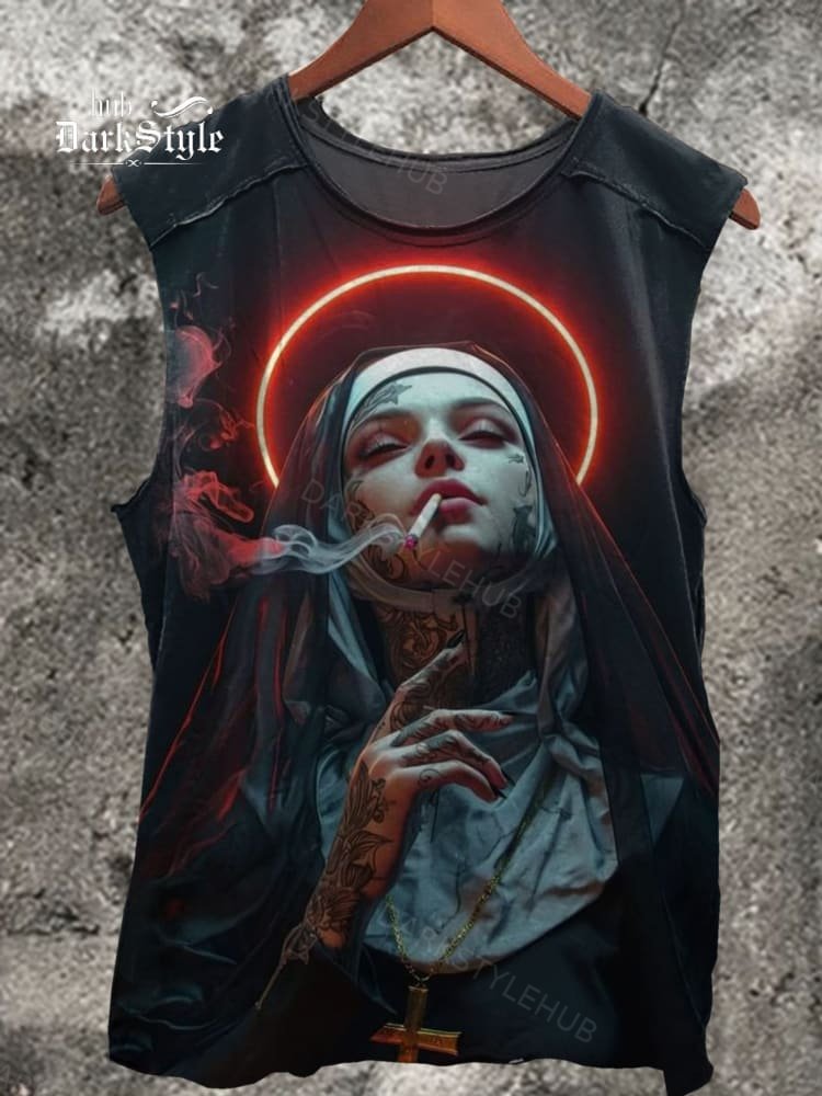 Smoking Tattooed Female Nun Print 100% Cotton Casual Tank Top