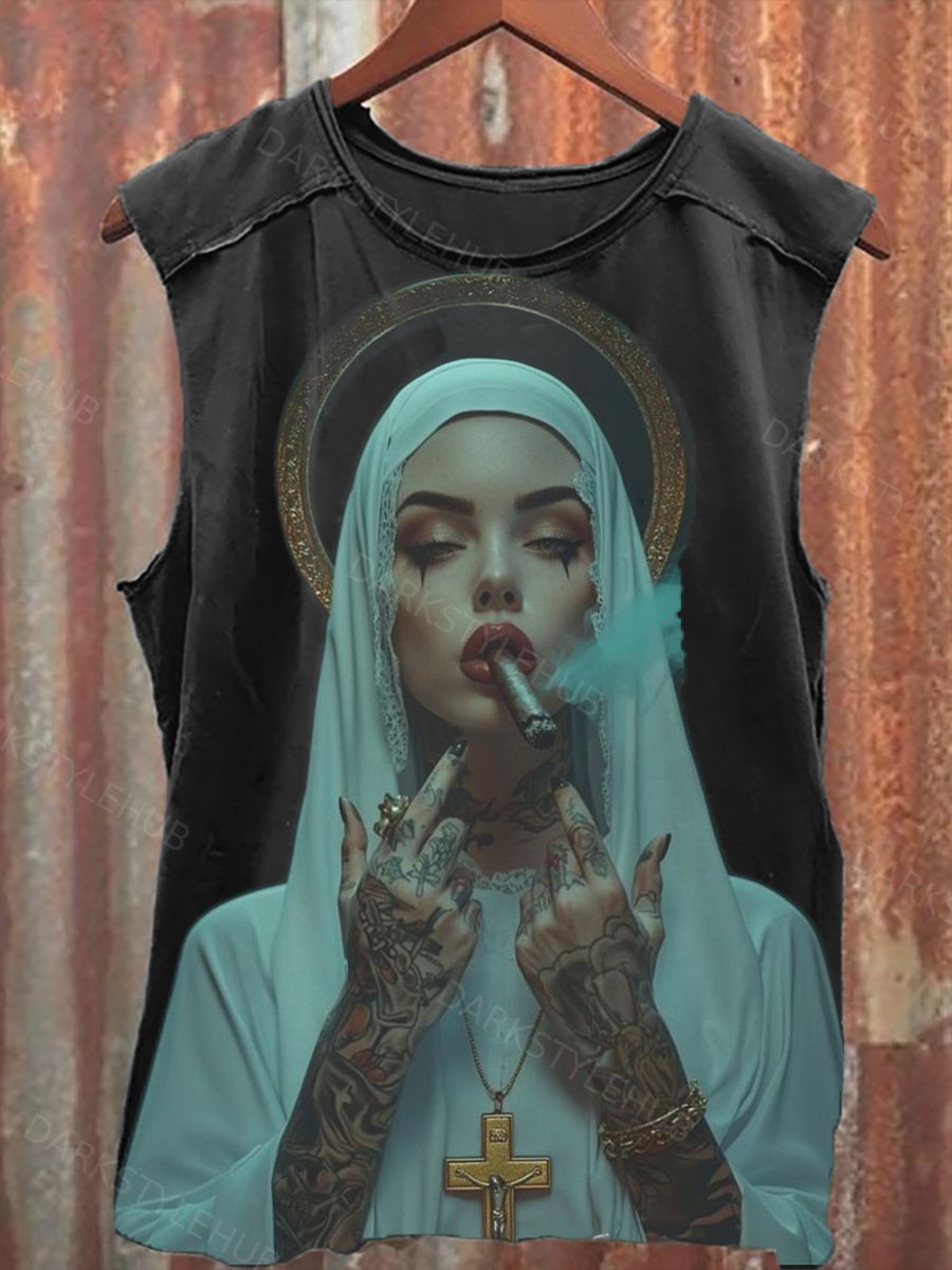 Unisex Smoking Tattooed Nun Print Casual Tank Top