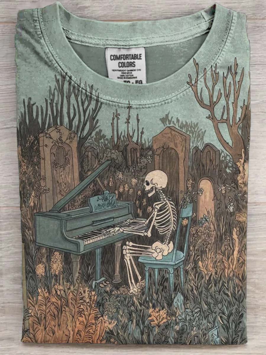 Fantasy Skull Pianist Print Casual Short Sleeve T-Shirt