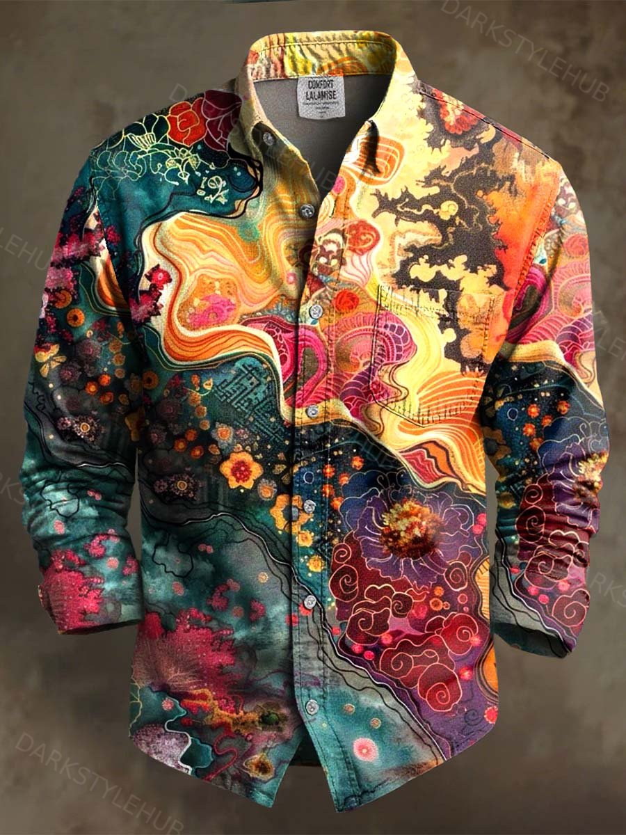Vintage Abstract Floral Ripple Art Print 100% Cotton Long Sleeve Shirt