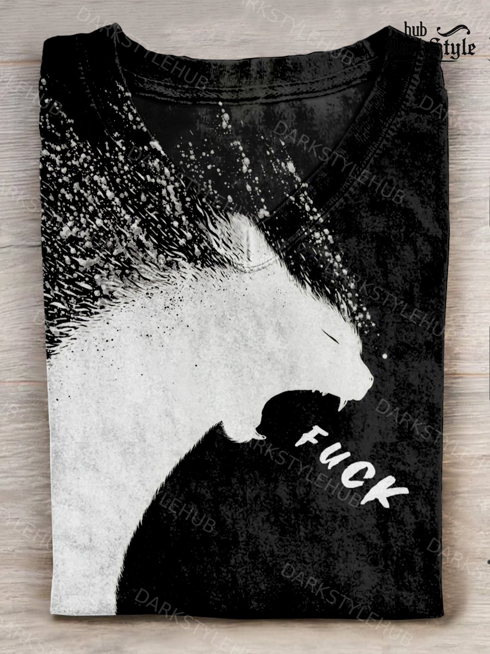 (V-Neck) A Cat Yelling Fuck Print Unisex Casual T-shirt