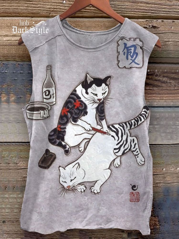 Cat In Tattoo Print 100% Cotton Casual Tank Top