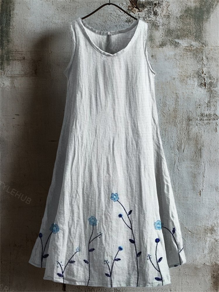 Classy Floral Embroidered Bottom Linen Tank Dress