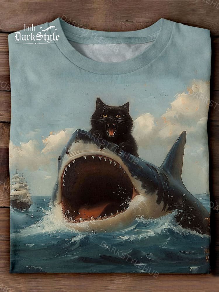 Funny Cute Crazy Black Cat Ride Shark Art Print Casaul Short Sleeve T-shirt