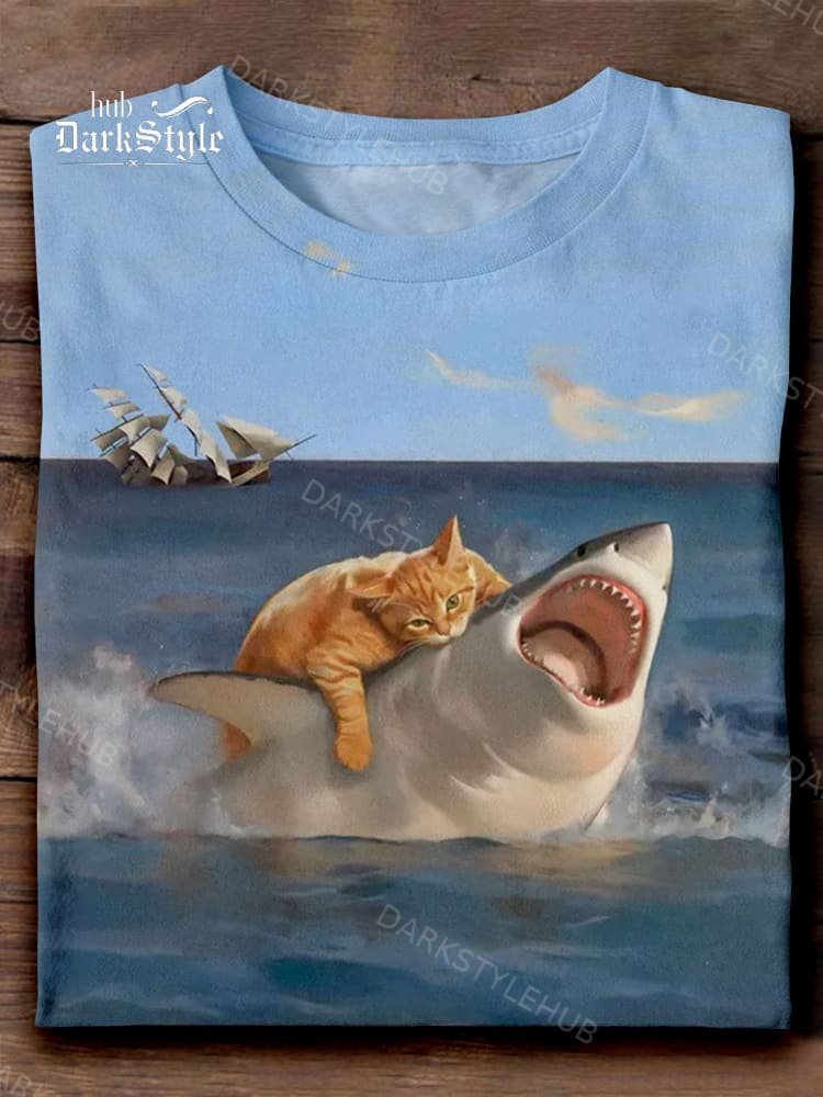 Orange Fat Cat vs. Shark Funny Art Print Casual Short Sleeve T-shirt