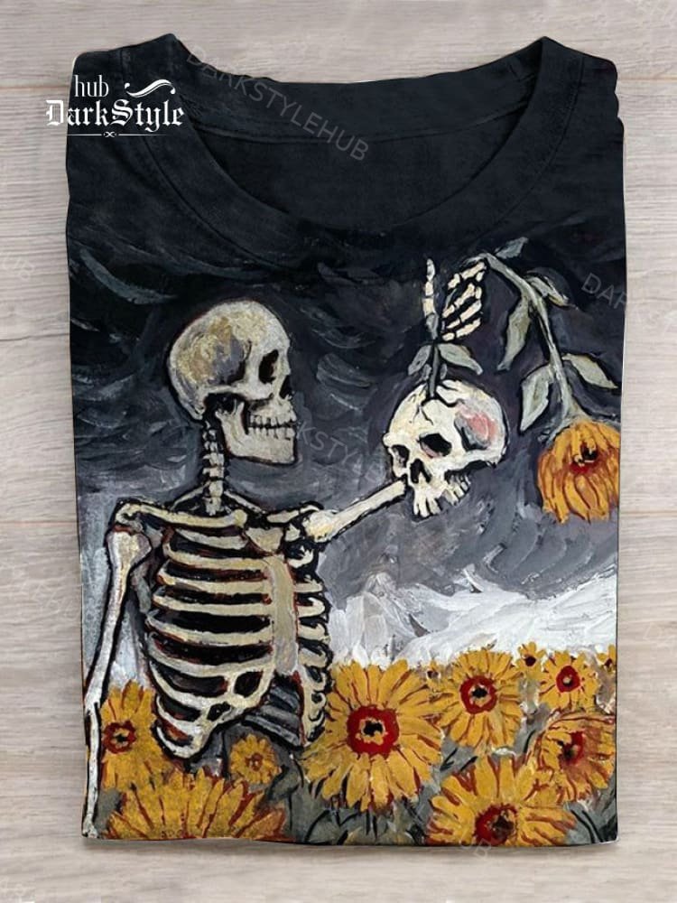 Skull Sunflower Unisex Print Short Sleeve Casual T-Shirt
