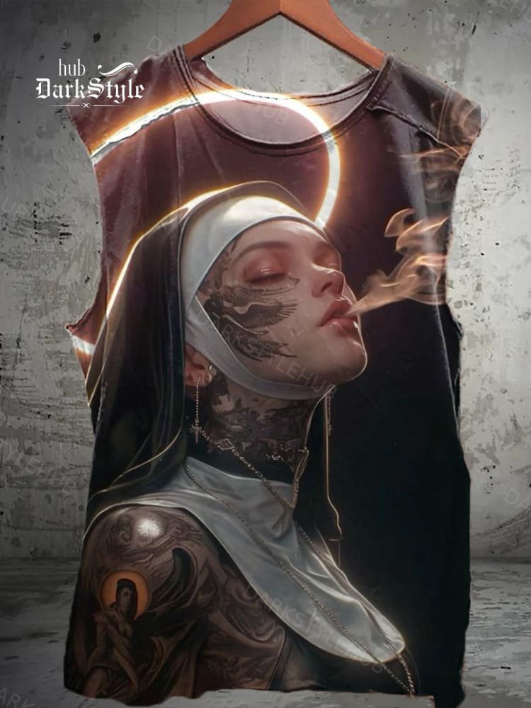 Smoking Tattooed Nun illustration Print Unisex Casual Tank Top