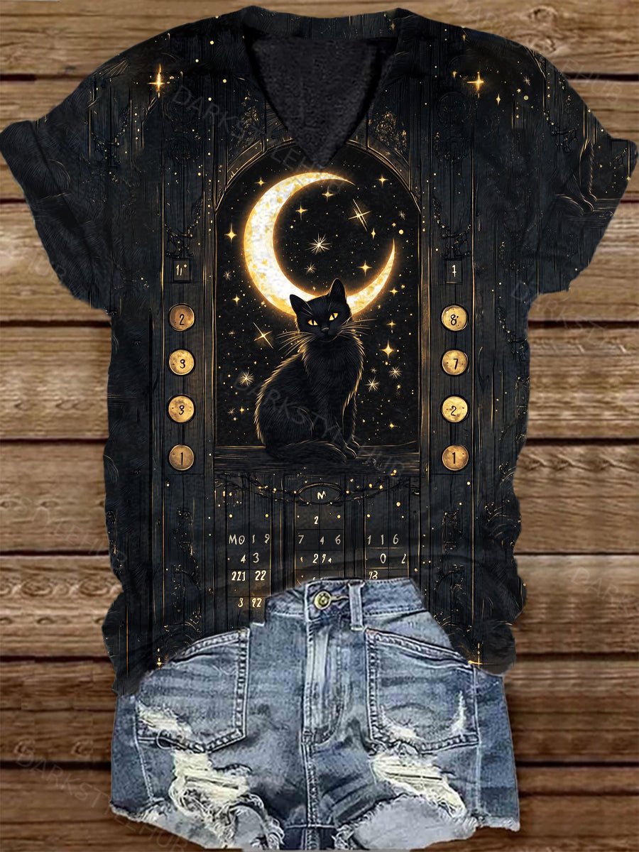 Unisex Cat Tarot Card Pattern Casual V-Neck Short Sleeve T-Shirt