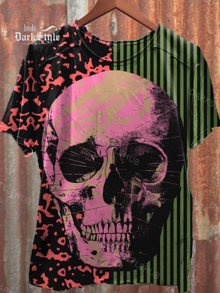 Unisex Retro Camouflage with Striped Skull Print T-shirt