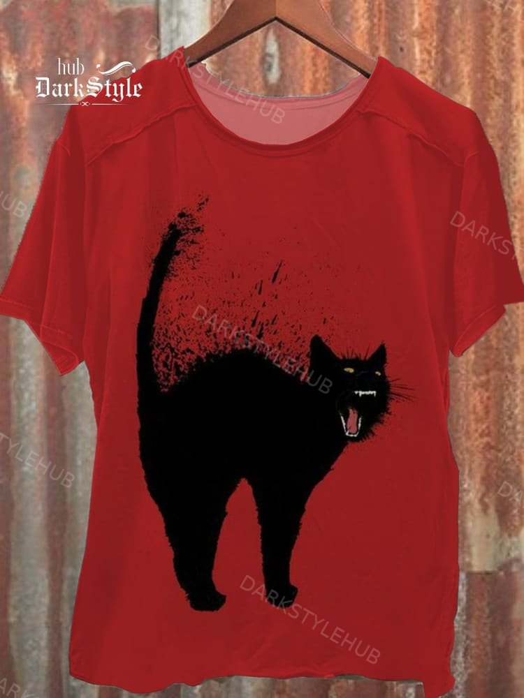 Unisex Vintage Red Black Cat Print Round Neck Short Sleeves T-shirt