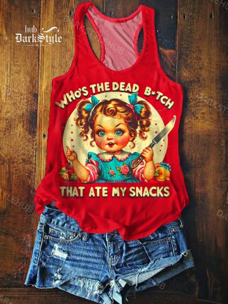 Women's Retro Funny Whos the Dead B*tch That Ate My Snacks Adult Humor Art Print Tank Top